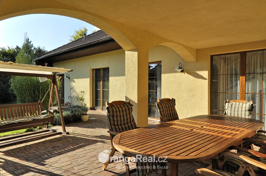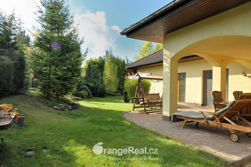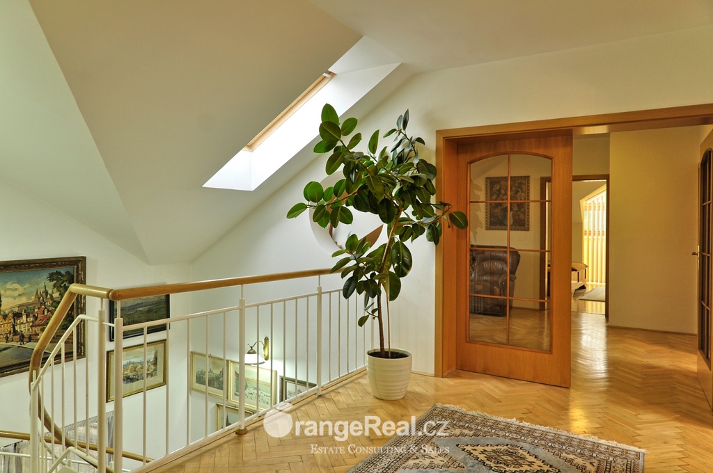Výhradně nabízíme k prodeji krásný rodinný dům v lokalitě Jesenice - Horní Jirčany. Dispozičně 8+1, o užitné ploše 334m2 + bazén 32m2 a terasa 44m2. Dům se nachází na pozemku o výměře 1.111m2, v bonitní a vyhledávané lokalitě. Dům sestává v I. NP ze zádveří /dveřmi propojené s garáží/ navazující na prostornou halu, z které je v pravém křídle domu přístup do kuchyně s jídelním zázemím a obývacího pokoje se vstupem do realxační bazénové místnosti /bazén, sauna, sprcha/, prosklenými dveřmi a okny opticky propojené se zahradou. Bazén je celoročně uživatelný, vyhřívaný. Obývacímu prostoru dominuje krb s krbovou vložkou, z místnosti lze vstoupit na prostorově velkorysou terasu s krytou částí. Ze vstupní haly lze dále projít do levého křídla domu, kde nalezneme koupelnu s toaletou, ložnici, šatnu a pracovnu. Po točitém schodišti se vystoupá do II. NP, které sestává z haly, šatny, komory, dalších čtyřech obytných místností, technického zázemí domu, koupelny a samostatné toalety. Vytápění domu, bazénu a ohřev TUV zajišťují 2 plynové kondenzační kotle, v I. NP podlahové topení, ve II. NP radiátory. Dům se nachází v přírodní lokalitě, ovšem v blízkosti hlavního města Prahy. Doprava do ZŠ školní bus zajištěný obcí. 8min Canadian scholl, MŠ i anglická, ZUŠ, golfové hřiště. Obchodní možnosti v místě, dále OC Průhonice, Chodov. Doplňující informace u obchodníka společnosti. Doporučujeme navštívit virtuální prohlídku na web stránkách naší společnosti.